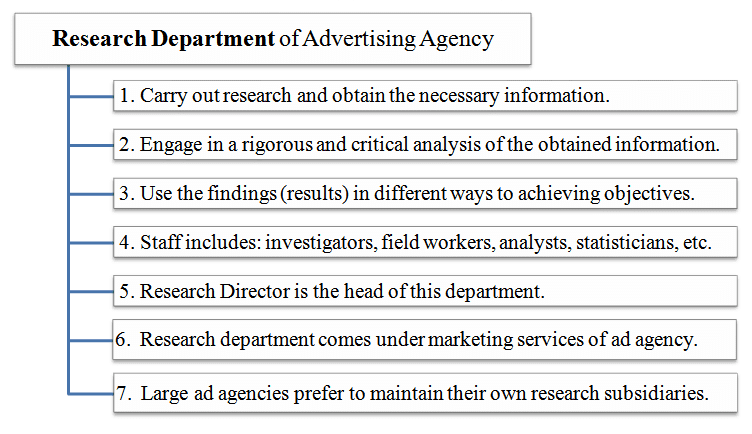 Some agencies have a creative branch instead of it that does the entire work of preparing an advertisement. Here, preparing an ad copy, artwork and actual production of ad are all linked together and executed completely by this department alone.